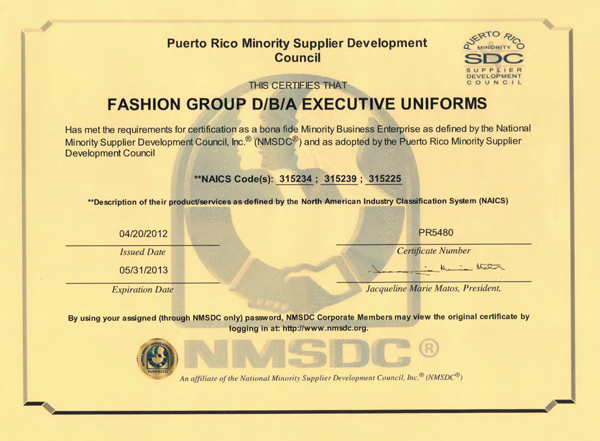 Fashion Group, Inc. está afiliada al "National Minority Supplier Development Council", Inc. desde el 2009.